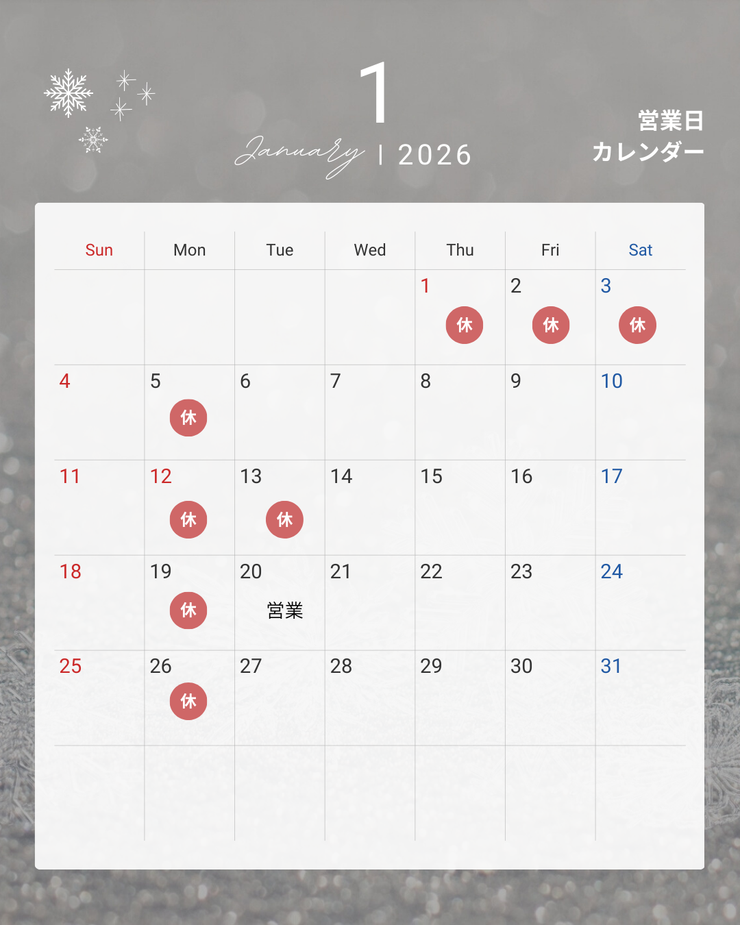 2026年1月営業日のお知らせです。